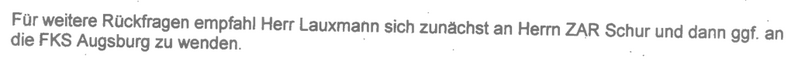 "Für weitere Rückfragen empfahl Herr Lauxmann sich zunächst an Herrn ZAR Schur und dann ggf. an die FKS Augsburg zu wenden." Gesprächsnotiz FKS Pfullingen Herr Lauxmann mit Zoll Offenburg